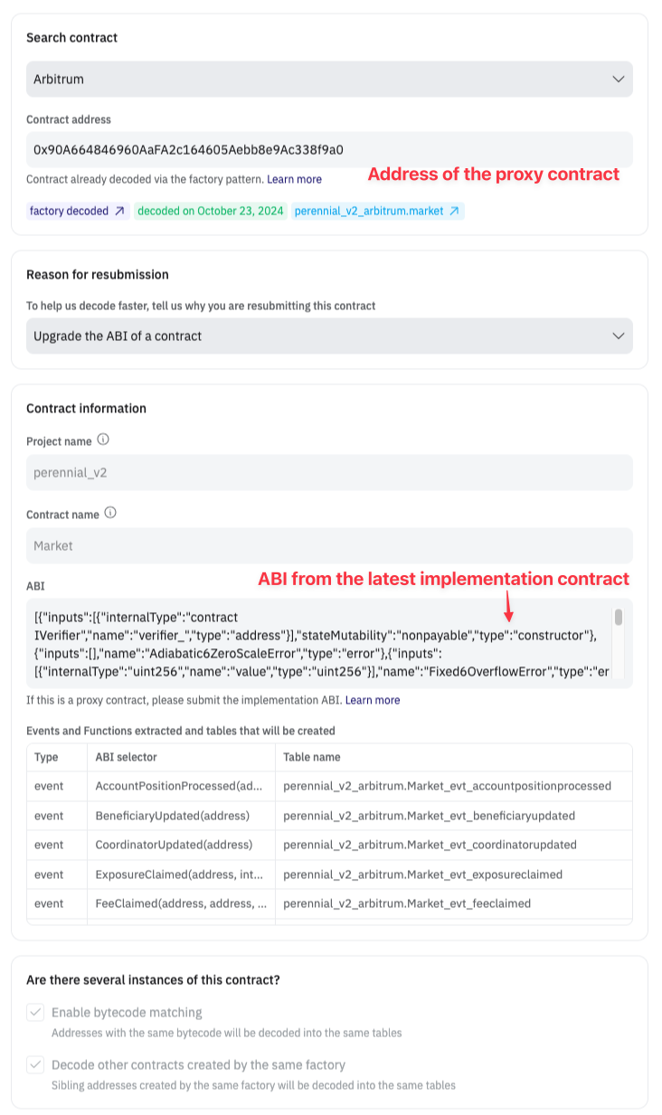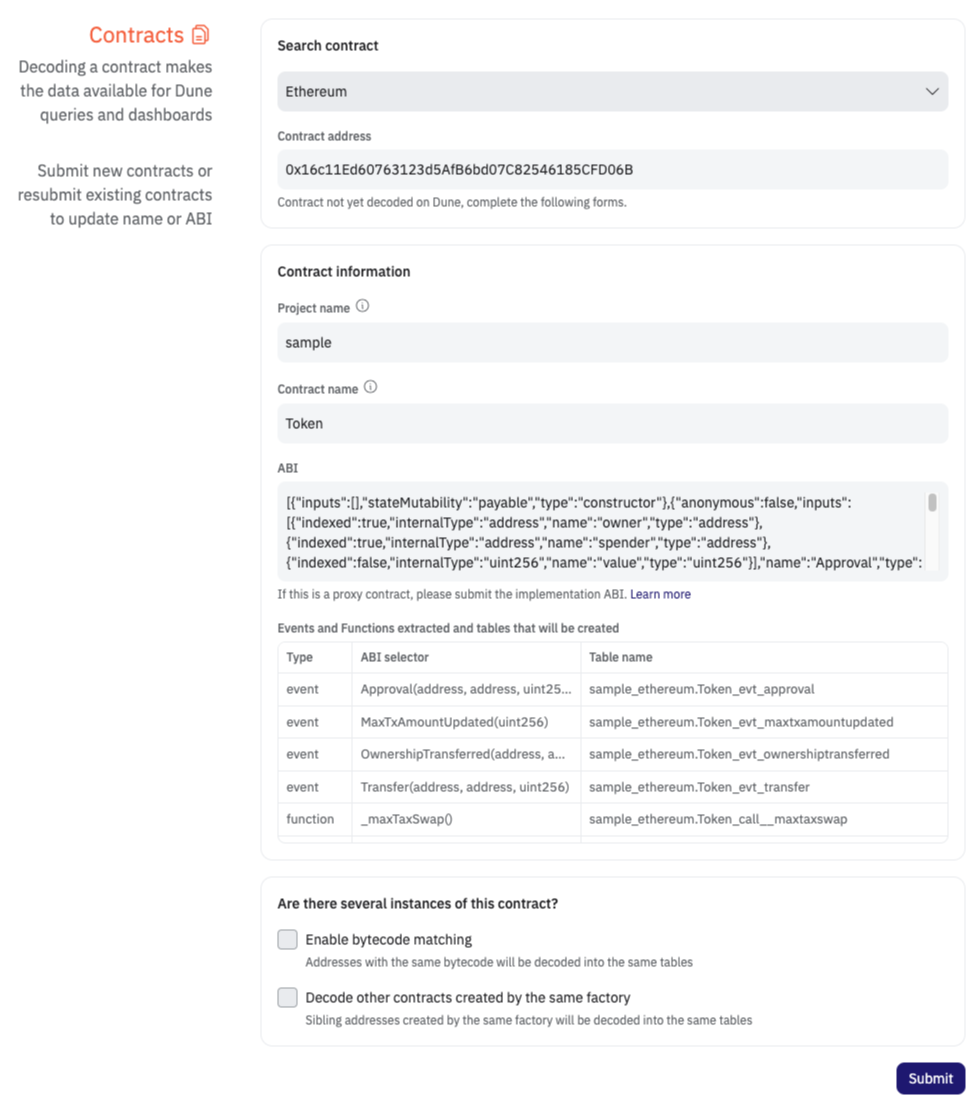 Contract “instances” are contracts on the same chain with the same bytecode (and therefore the same ABI) for the same project. If you check this box, Dune can decode all instances of this project on the given blockchain with the same bytecode and ABI, consolidating them into the same tables under onenamespace.project directory without multiple submissions.