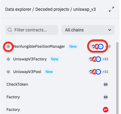 Multichain decoded contract tables are accessible in the Data Explorer, just like regular decoded contract tables. These multichain entries feature a distinct symbol and display the list of supported chains, clearly indicating they span multiple chains.